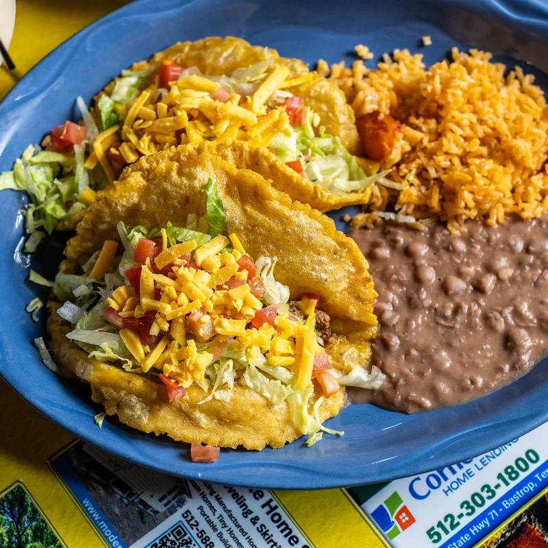 Two handmade taco shells, with choice of ground beef or shredded chicken, topped with lettuce, tomato, and shredded cheese. Served with rice and beans.